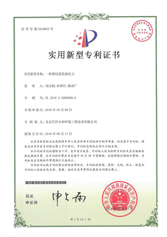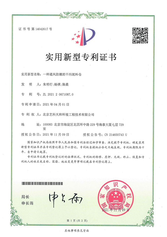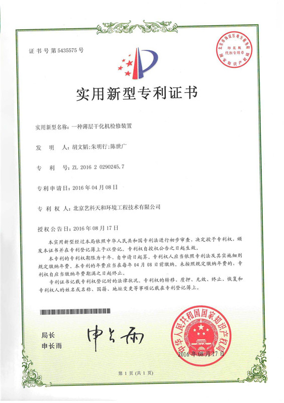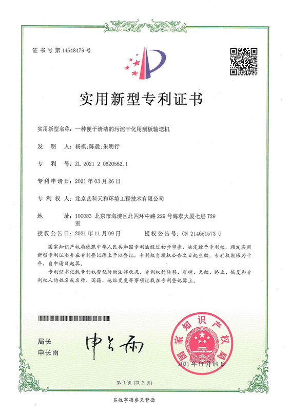 2018年开始进行国产污泥薄层干化机的技术研发工作,4年期间投入大量人力财力进行核心技术研发,并取得显著成果,获得多项相关专利,且被认定为国家高新技术企业。