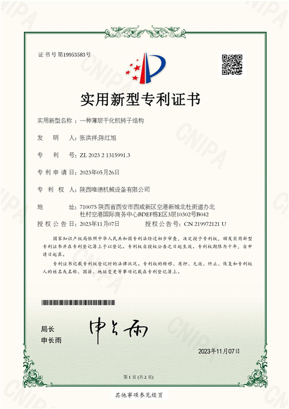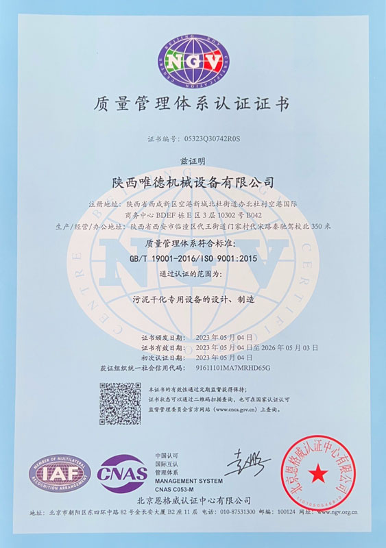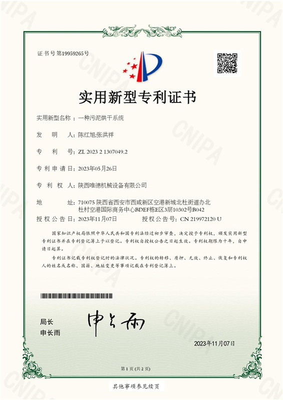 经过几年的技术积累,于2022年成立陕西唯德机械设备有限公司,进行污泥薄层干化机的本土化制造。至此,陕西唯德机械设备有限公司完成结构优化布局,升级为集国产污泥干化设备的研发设计、制造、销售一体化的环保技术企业。